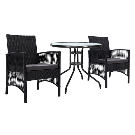 Gardeon 3PC Bistro Set Outdoor Furniture Rattan Table Chairs Patio Garden Cushion Black