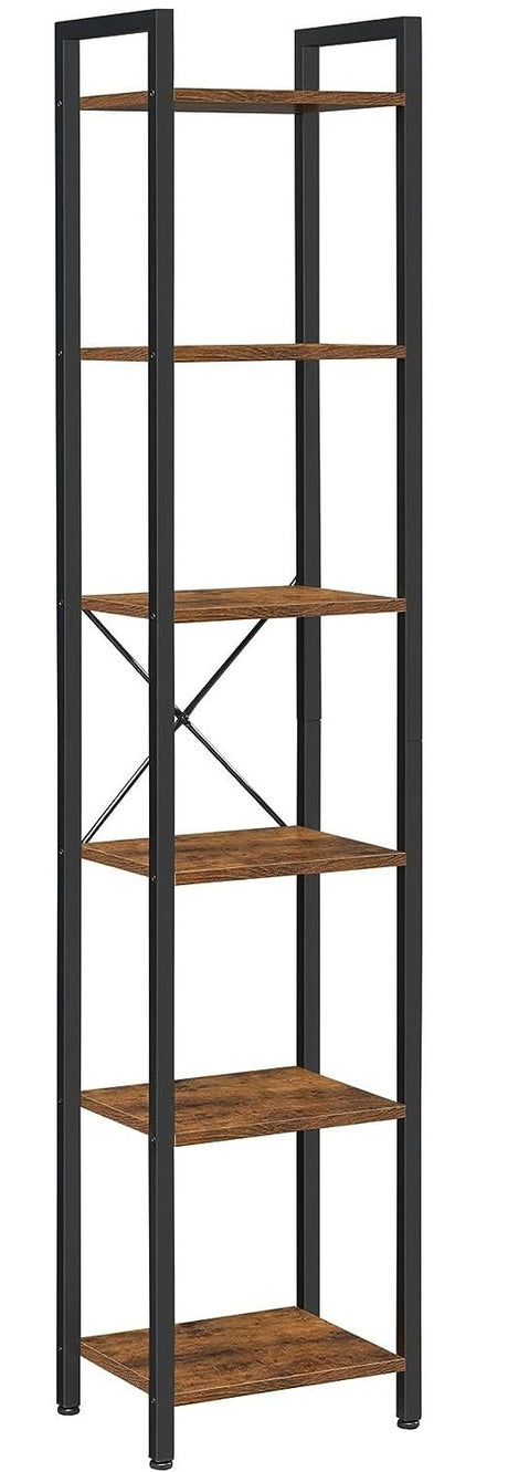 Small 6-Tier Industrial Bookshelf, Rustic Brown, Black