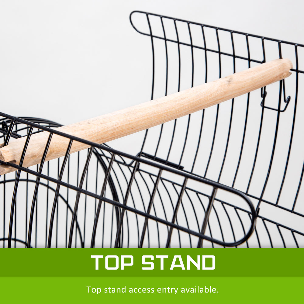 The cage's frame is made of durable and high-quality wrought iron and it is powder coated in order to prevent it from rusting and offer a longer service life. There is one lockable door on the front and one on the top of the cage so you can keep your bird safe and have easy access inside the cage. There is also a removable tray under in order to make cleaning easy. There are four, 360 degree swivel caster plastic wheels so relocating the birdcage is very easy. 2 water/food container and 2 rest wooden perches are included. The cage also has a clever shelf under it so you can store your birds' needs, such as water, food and cleaning tools. Another good feature is that the bird dome on top is removable from the stand so you can place it on top of tables or other places.