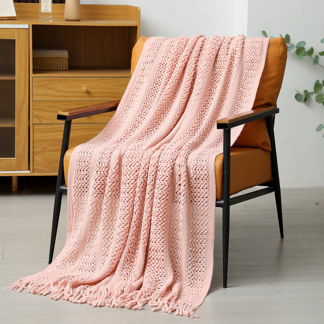 Pink Hollow Knitted Sofa Blanket with Tassels, 120 x 165 cm, 510g, Ideal for Hotel and Home