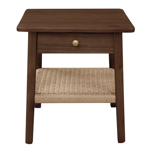 Bring a touch of mid-century style to your space with the Kelly One Drawer Bedside. Made from Solid Mindi timber (White Cedar), this piece showcases the natural beauty of the wood, highlighted by a smooth almond finish that enhances its warm, organic texture. The solid brass handle offers a classic look, while the handwoven loom shelf adds character and provides extra storage. This bedside table comes fully assembled, so it's ready to use right away. With dimensions of WDH: 50.0 x 45.0 x 55.0 cm, this bedside table combines practical design with a style that suits both modern and mid-century-inspired interiors.