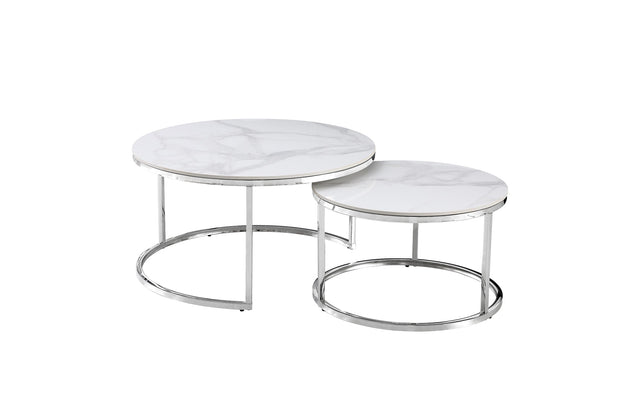 The Nesting Style Coffee Table in White on Silver Stainless Steel is a stylish and functional piece of furniture that features a white marble top with a stainless steel frame finished in silver. The table comes in two sizes, with the smaller table fitting neatly underneath the larger one to save space when not in use. Each marble top finish might vary in pattern, making each piece unique.