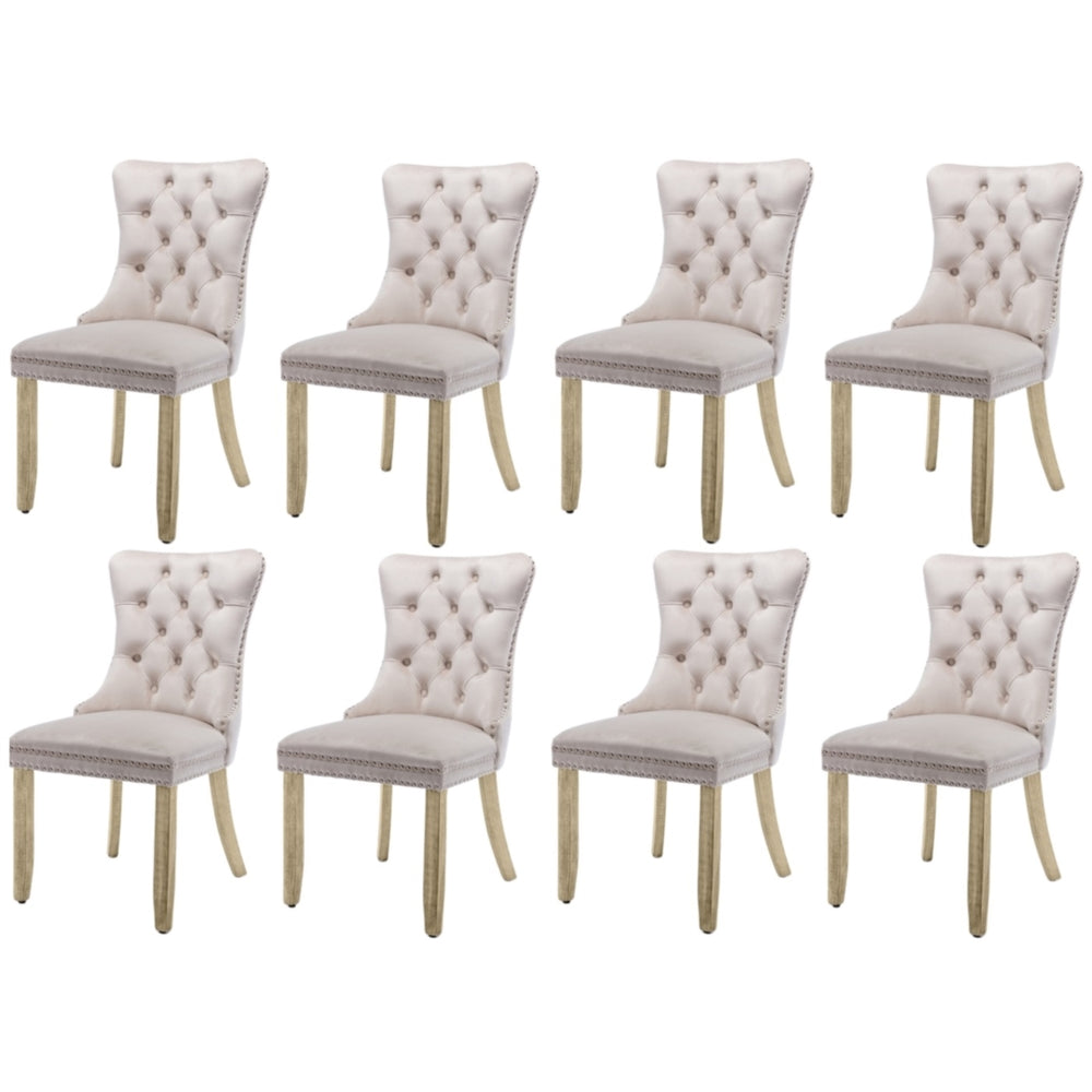 8x Velvet Dining Chairs Upholstered Tufted Kithcen Chair with Solid Wood Legs Stud Trim and Ring-Beige