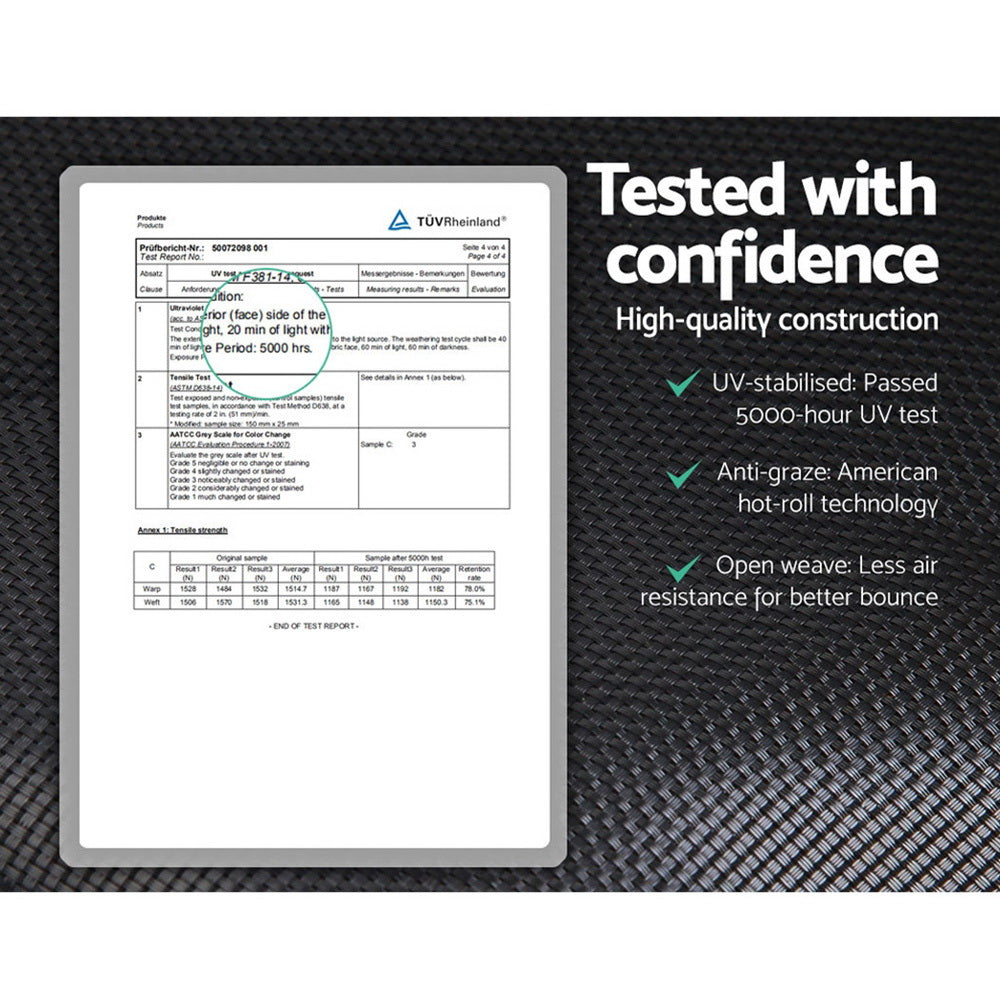 Bounce to your heart's content with our Trampoline. With its superior bounce characteristics featuring 72-piece triple rate springs, the 12-foot trampoline enables safe and durable bouncing with no worries. The heavy-gauge steel framework is designed to handle all robust play and is UV-tested for quality and reliability. Other great features include 8 posts for strong support, 20mm thick padding, anti-graze mat, safety netting and a double-lock zip-and-clip entry. So jump to it and order our trampoline today.