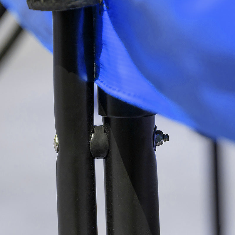 This is a heavy trampoline and uses linked legs and grounding straps for superior stability. The structure of the legs also minimises the tendency for legs to dig into the ground.