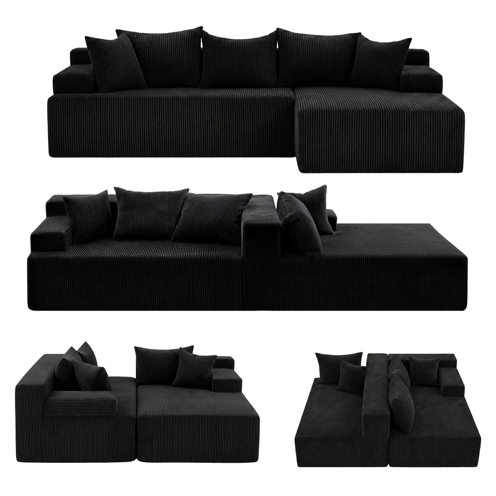 Introducing the Artiss 4-Seater L-Shape Modular Sofa, the perfect combination of style, comfort, and functionality for your large living space. This sectional is specifically configured as 2 individual L-shaped oversized chaises, allowing for unparalleled versatility. Easily separate or combine the pieces to create the perfect arrangement for any space or occasion.. The furniture is beautifully wrapped in Premium Corduroy Fabric, lending a sophisticated texture and warm aesthetic. Sink into the superior comfort provided by the High-Density Foam Cushioning, which delivers a truly cloud-like and soft supportive experience across every seat, especially the deep chaise. The elegant curved couch design and armrests enhance its inviting appeal. Built for durability, this sofa boasts an impressive 500kg strong load capacity and is designed with a reliable No-Slip Bottom to ensure the L-Shape configuration remains stable on any floor. Best of all, your relaxation starts immediately: this sofa requires No Assembly Required, allowing you to arrange the pieces and enjoy luxurious lounging moments after unboxing. The unit is completed with five matching pillows for extra comfort and flair.