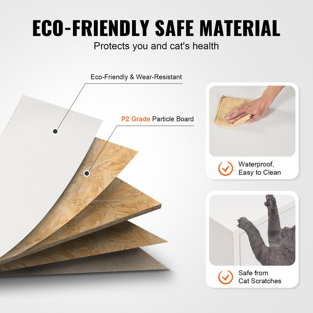 The P2 grade particle board ensures the health and safety of pets and your whole family. The high-quality finish surface with smooth edges is waterproof, easy to clean and maintain, wear-resistant and damage-resistant, and not afraid of cat scratching. The board is pre-drilled and numbered for your convenience.