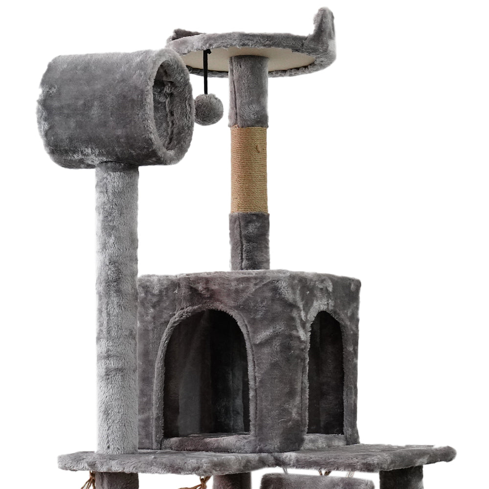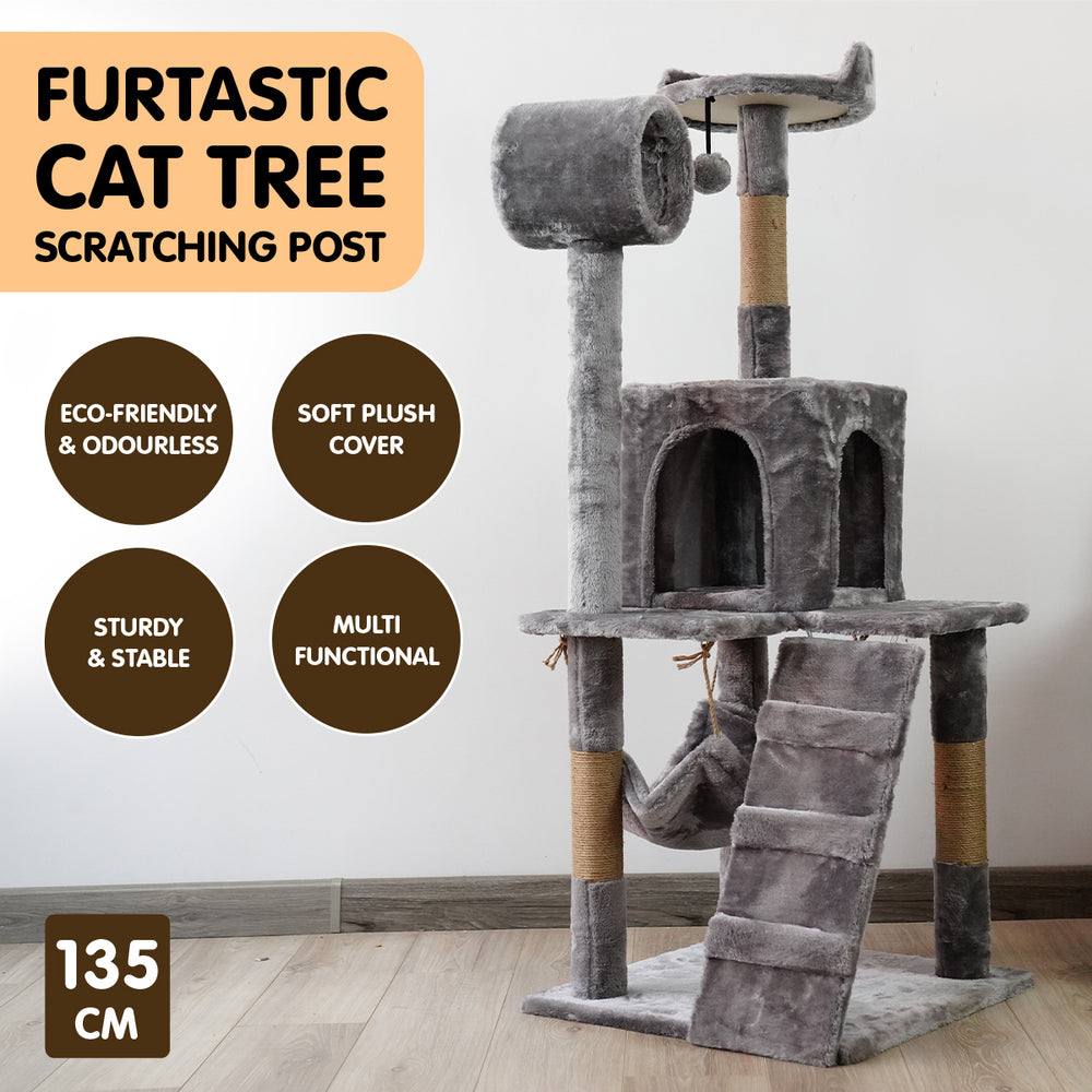This sturdy cat tree is 135cm tall and features a cubby house, tunnel, ramp and multiple storeys for your pets to explore. It's covered in soft plush fabric that's comfy and stylish, perfect for lounging and napping. The dangling toy at the very top encourages curious kitties to climb, while the built-in scratching post provides a healthy outlet for their scratching instincts. Finally, the hammock offers a cozy place to curl up and rest.