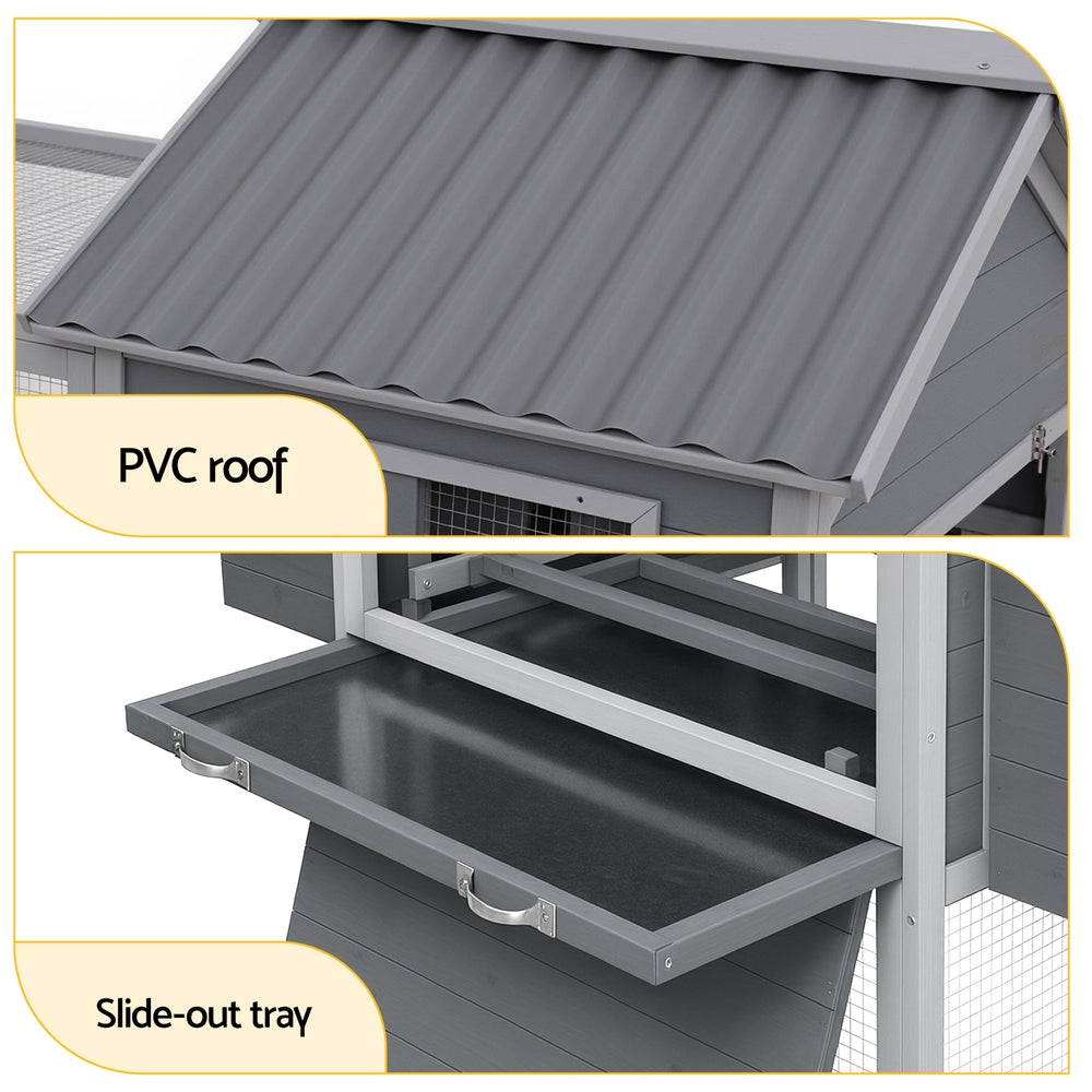 Give your feathered friends a safe and comfortable home with this spacious chicken coop. Designed for practicality, the large enclosed play area features an integrated ramp for easy access and includes a dedicated hatching box for convenient egg collection. Built tough to handle our climate, the coop is constructed from durable, weather-resistant fir wood and topped with a sloped PVC roof for effective rain runoff.Rest easy knowing your chooks are secure thanks to the strong, powder-coated galvanised wire mesh and reliable latches. Cleaning is a breeze with the handy slide-out tray. Provide your chickens with a secure, durable, and easy-to-maintain shelter.