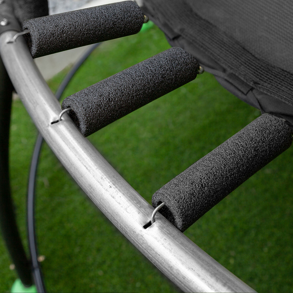 Bounce the day away on the 16ft HyperJump 4 Spring Trampoline. The new series HyperJump 4 offers all the big bounce benefits of a spring trampoline with increased protection from metal components. Little ones can jump, twist and flip carefree on the HyperJump 4 with the support of the reinforced safety netting and foam-covered metal springs to protect small wandering hands. Our curved poles allow kids to safely fall on the net with the smart zipless entry making it easier to enter and exit the trampoline.