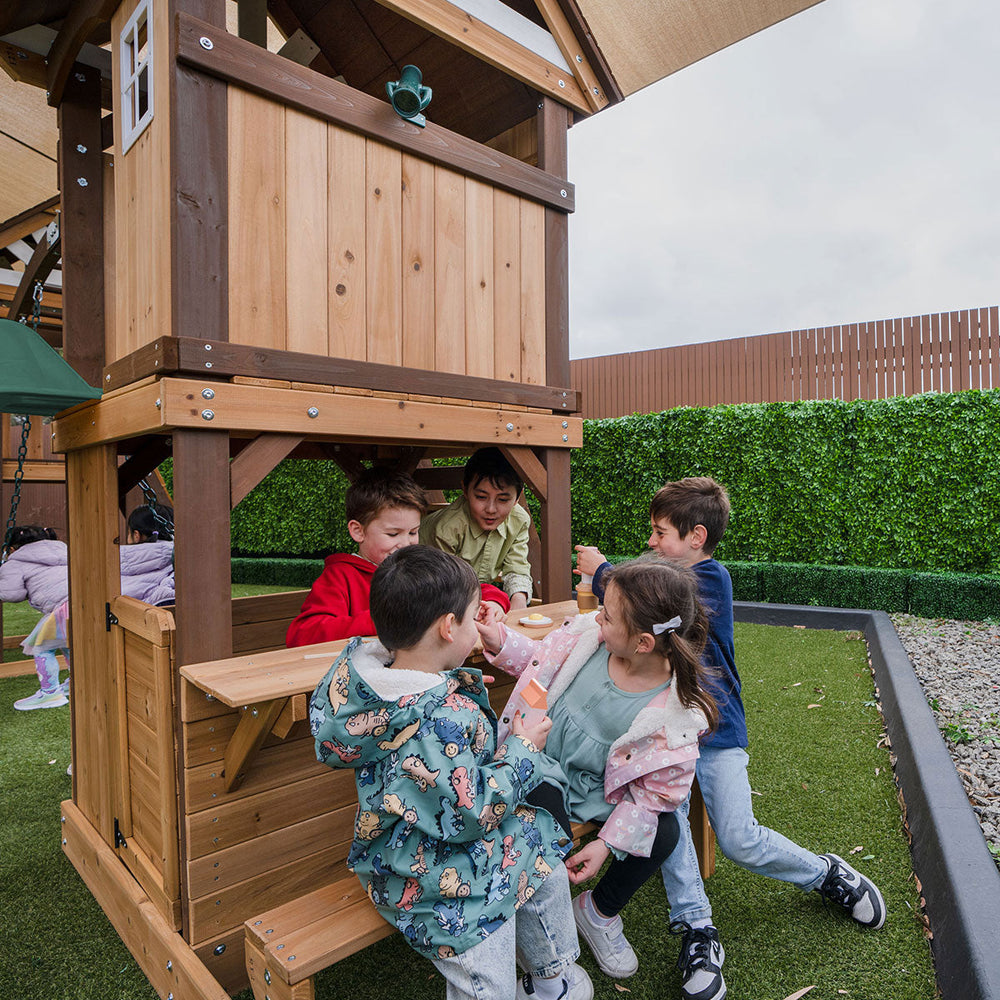 The Armadale Play Centre is the ultimate backyard adventure hub, featuring an architecturally unique curved swing beam and monkey bars combo between two separate towers. The dual 2.2m wavy slides is perfect for kids to race each other to the bottom and then race back up on the abseiling rope and rock-climbing wall. With three swing positions, including two swing seats and a trapeze, the Armadale caters to active play. Sourced from sustainable timber and treated for durability, it meets strict Australian standards, ensuring a safe and eco-friendly play experience for kids.