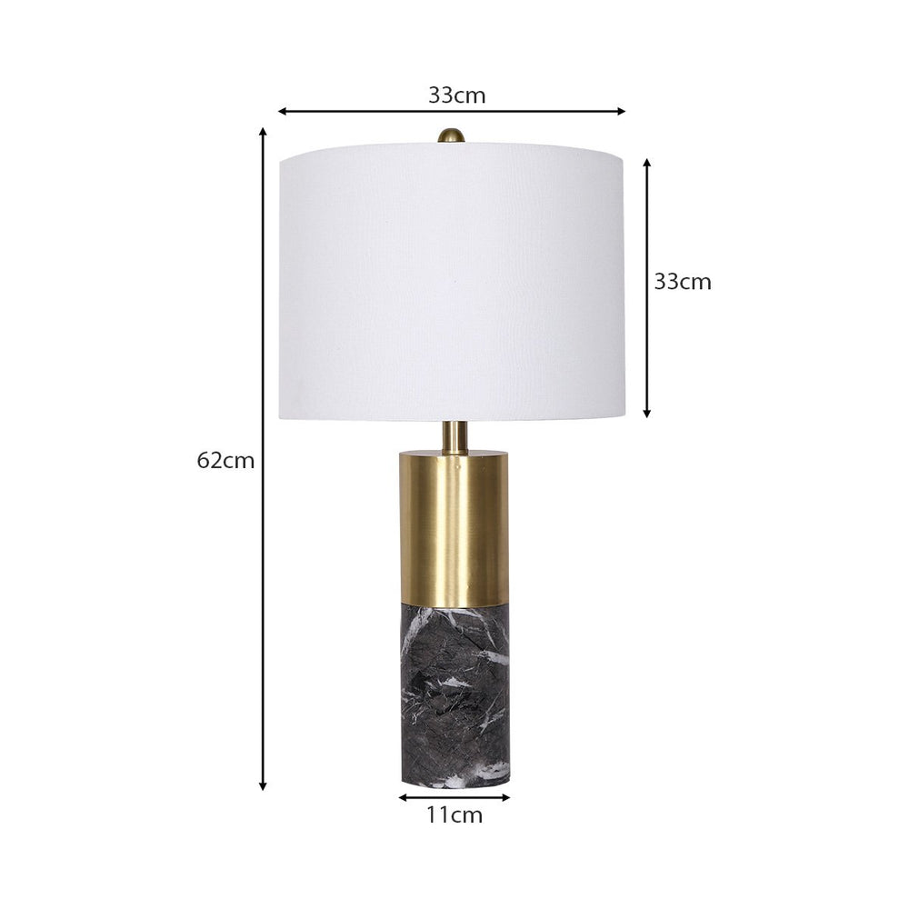 Elevate your modern home with our Metal and Marble Table Lamp, a seamless blend of luxury and contemporary appeal in design. Meticulously crafted, the lamp boasts a stunning golden brass metalwork that exudes elegance and the refined black marble decal introduces a dash of sophistication to any room. Crowned with a white drum shade, this lamp harmonises chic aesthetic and practicality, casting a gentle and welcoming glow over your space.