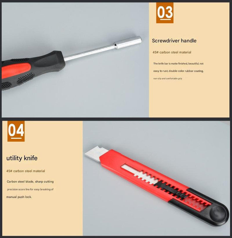 - 39 Essential Tools: Includes 8pcs hexagon socket, 20pcs screwdriver bits, 4pcs precision screwdrivers, 1pc screwdriver handle, 1pc 6-inch carp pliers, 1pc extension rod, 1pc utility knife, 1pc 8oz claw hammer, 1pc 8-inch scissors, 1pc 3m measuring tape.
