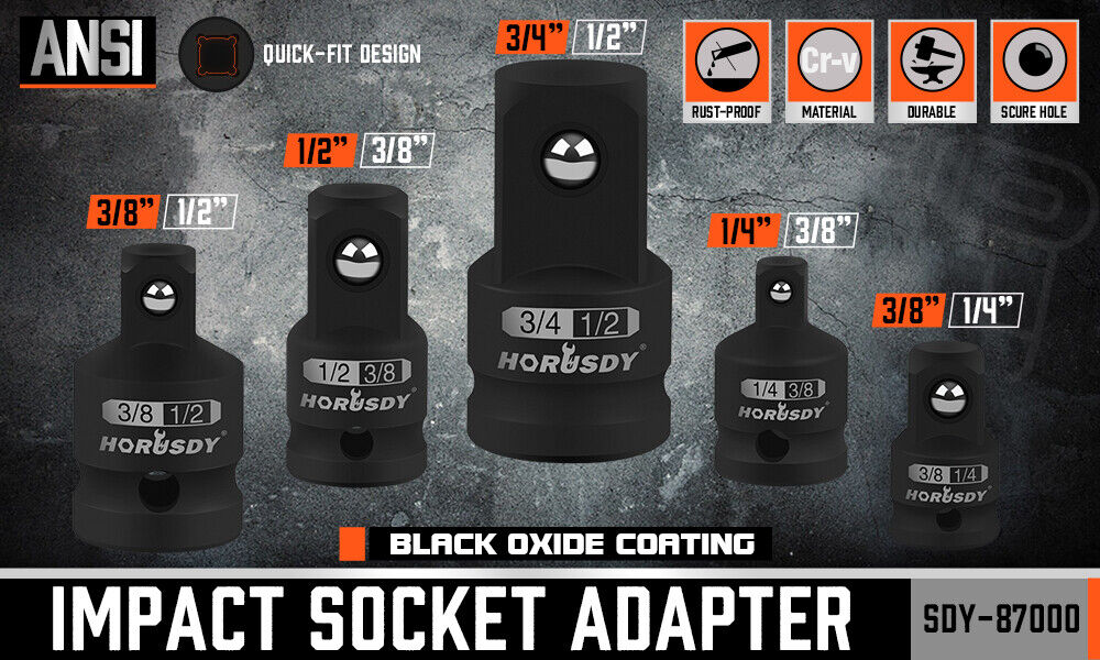 - HIGH MATERIAL:This impact adapter reducer set is constructed of heavy duty drop forged and heat treated chrome vanadium steel.