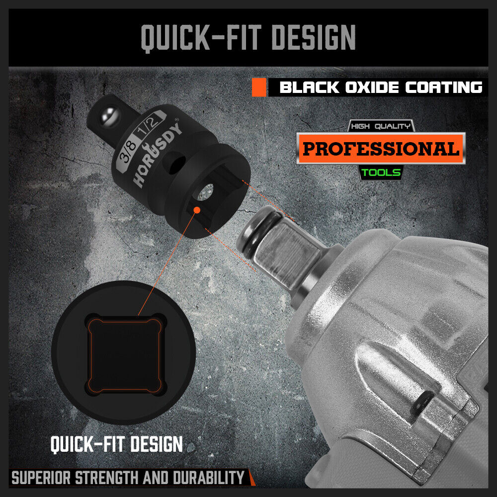 - 5PCS SET INCLUDES: 2 reducers in 3/8” female to 1/4” male and 1/2” female to 3/8” female. 3 adapters in 1/4" female to 3/8” male, 3/8”female to 1/2” male, 1/2"female to 3/4” male to convert all your impacts to different size sockets.