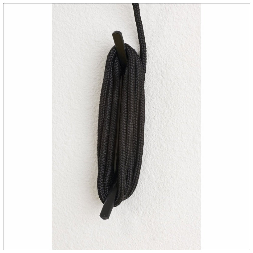 Two wall-mountable brackets with runners and rope, fitted with rubber-coated hooks to prevent scratching and other damage to paintwork and soft materials.