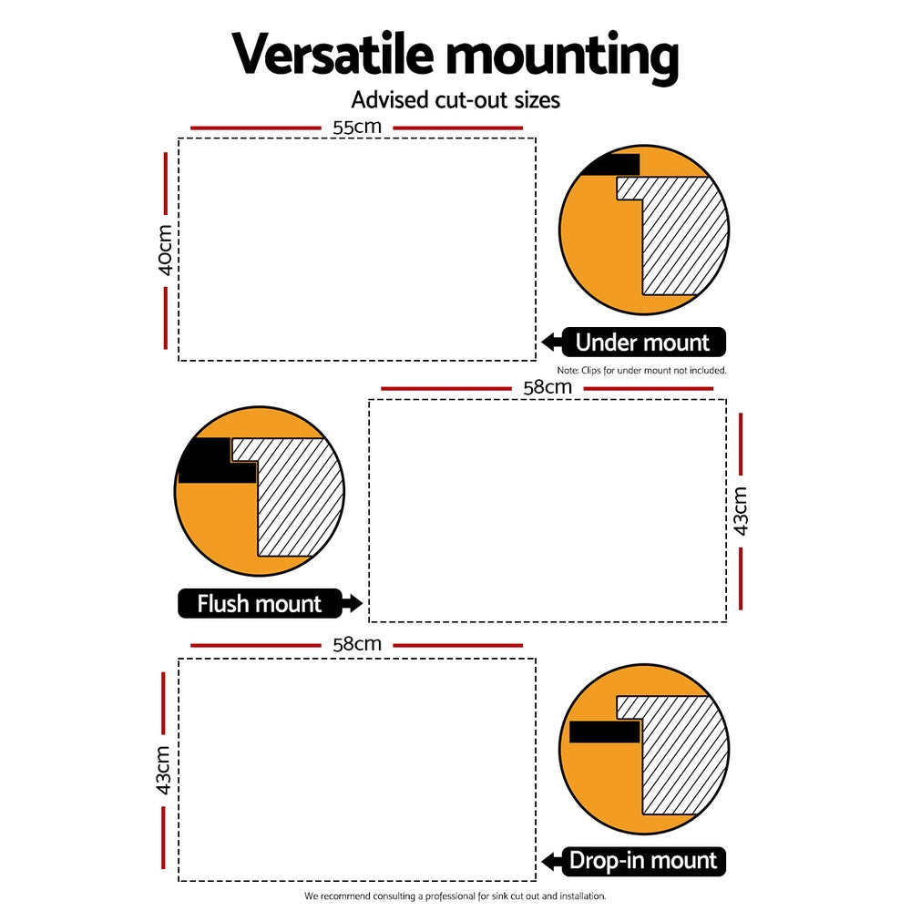 Suitable for under mount, flush mount, and drop in mount