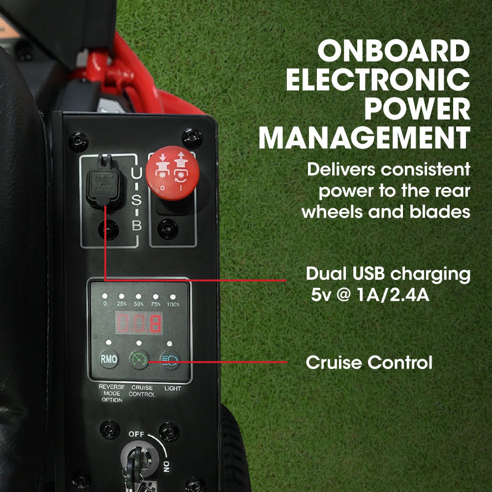 Mowing is a pleasure with an ergonomic steering wheel, cruise control, cup holder and an adjustable seat that has an integrated suspension system. There are even dual USB ports so you can keep your phone charged while using it.