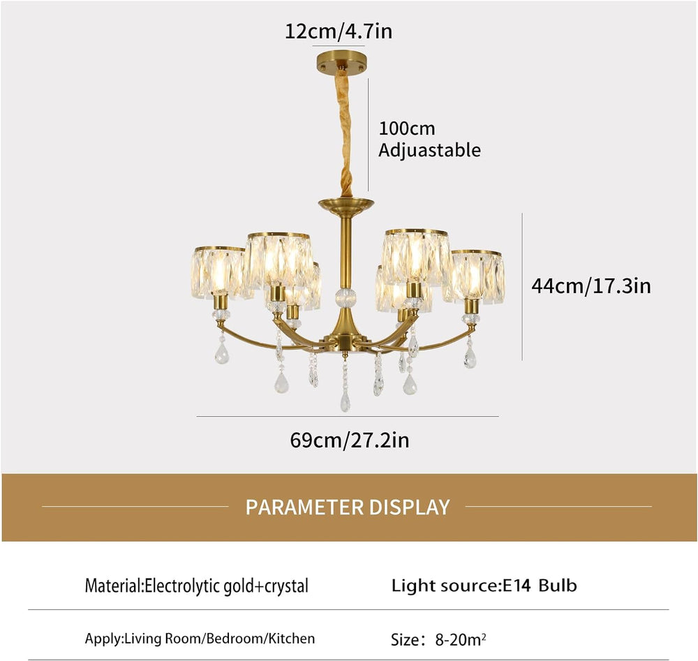 - Add a touch of elegance to your home with this unique Crystal Gold Chandelier. Its Nordic modern design features a solid metal circal in electroplated copper finish and premium crystal lampshade, creating a warm, bright and comfortable atmosphere in any room. With its simple yet fashionable look, this chandelier will be sure to highlight your taste and bring a touch of sophistication to your home.
