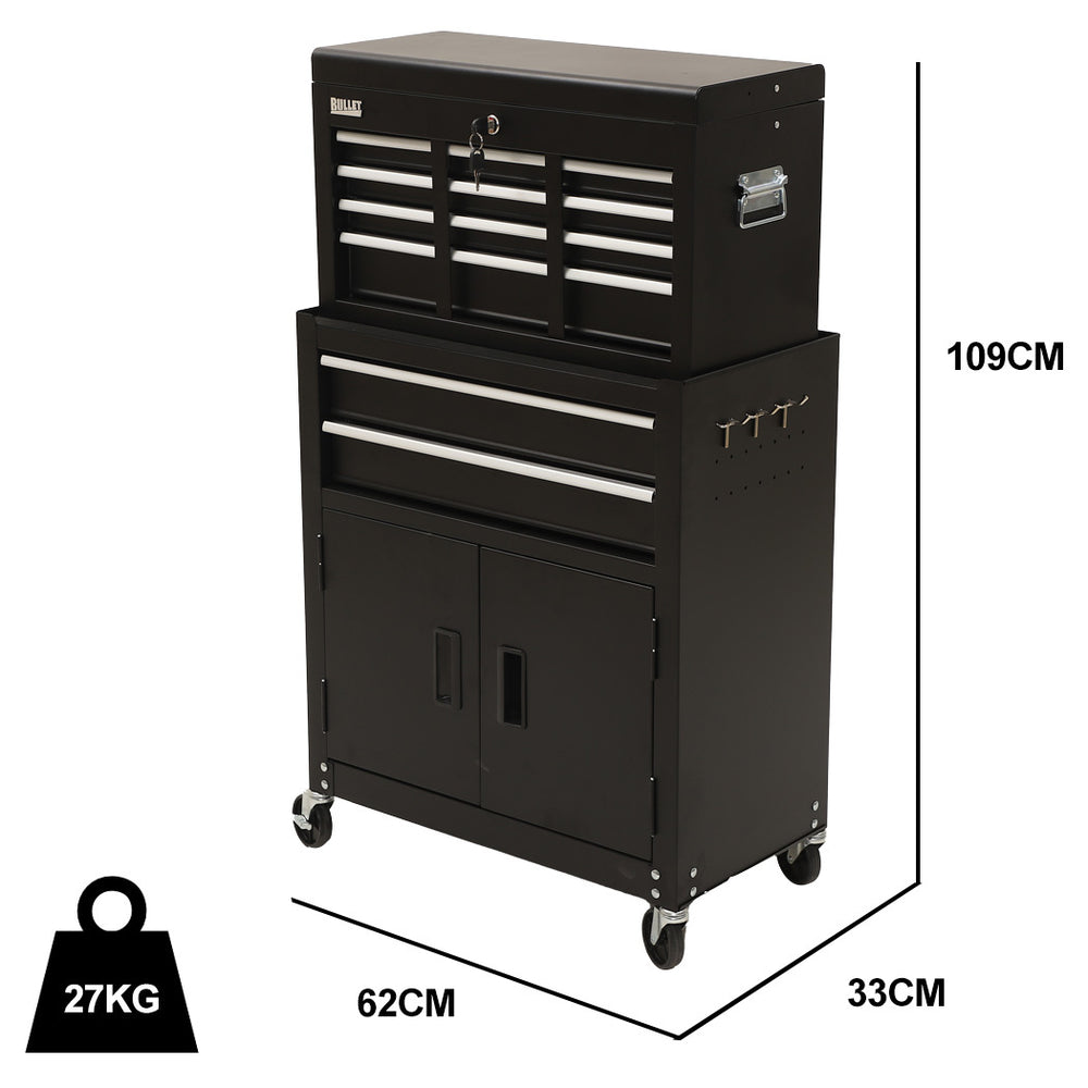 The New Bullet 8-Drawer Tool Box Cabinet is the ideal storage solution for all your tools, parts and hardware. Made with premium materials, this compact and manoeuvrable split unit is a must have for any garage or workshop. It provides a totally contained tool cabinet package designed to save you time, energy and make your work environment more manageable.