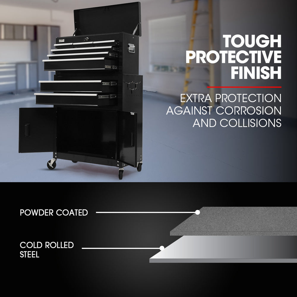 Both the cabinet and chest are built with high tensile powder coated steel enclosures. Equipped with an EVA mat, each drawer slides effortlessly in and out on smooth ball bearing rails, which makes finding and accessing each tool a cinch. The cabinet also comes with 3 pegs and the chest is easily transportable thanks to its side carry handles.