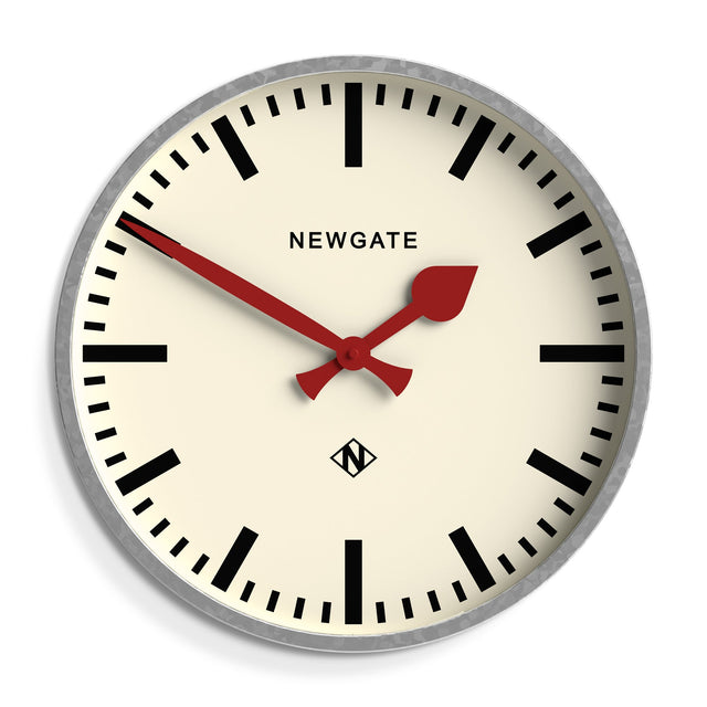 Newgate Universal Wall Clock Railway Dial Galvanised A large galvanised station wall clock with a bold marker dial, contrasting red hands and a deep straight-cut metal case.