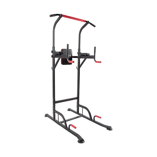 - Includes pull-up and dip bars, leg press station, and knee raise station