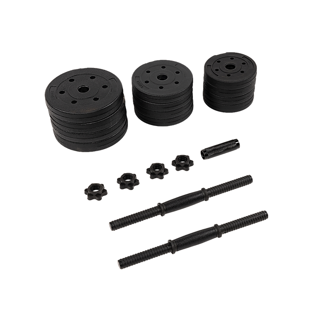 - Accessories: 4x 2.5-kg weight plates, 4x 1.25-kg weight plates, 4x 1-kg weight plates, 4x spin-lock collars, 1x connector and 2x bars