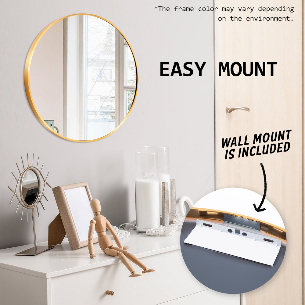 Please note it's neither brass gold nor rose gold. Our aluminum mirror, part of the gold color theme, has a unique shade within the gold spectrum. The frame color may vary with light due to aluminum's reflective nature.