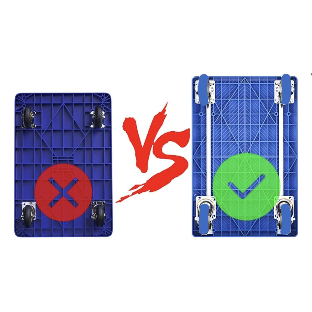 The platform dolly cart's clever foldable design allows for easy storage when not in use. When folded down to approximately 60cm x 90cm x 15cm, it takes up minimal space, making it ideal for smaller storage areas or transporting in vehicles.
