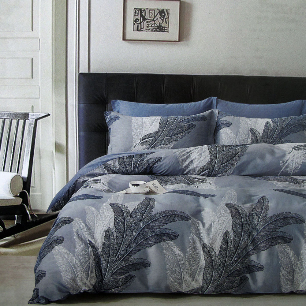 300TC Palm Leaf Blue Reversible Cotton Quilt Cover Set Queen