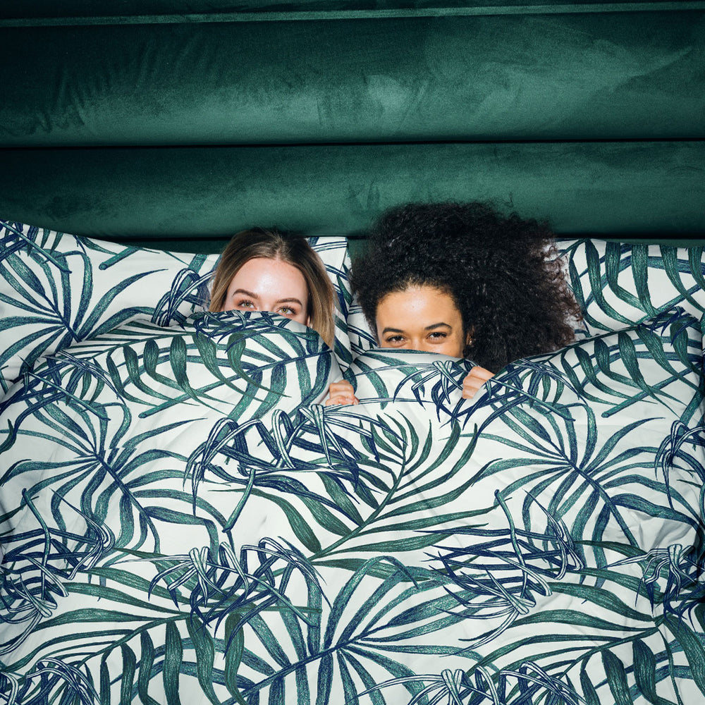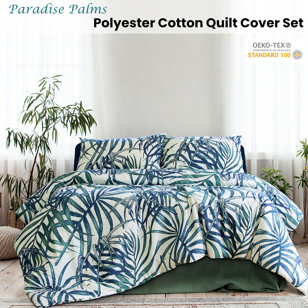 A tropical canopy oasis with hand-rendered palm branches in tones of bluey greens to replicate exactly how it would feel to look up underneath tropical palms. This Paradise Palms Blue Polyester Cotton Quilt Cover Set by Ardor completes a holiday escape within the bedroom. It features foliage design printed in sage, blue, and green colour tones. It is made from soft touch and easy care Polyester Cotton fabric with long lasting quality.