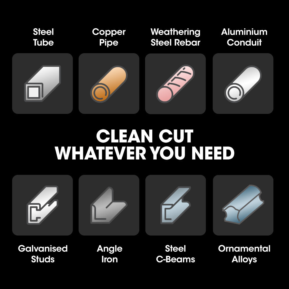 - Easily cut wrought iron, rebar, beams, aluminium, copper, brass and bronze, and any shape of pipe.