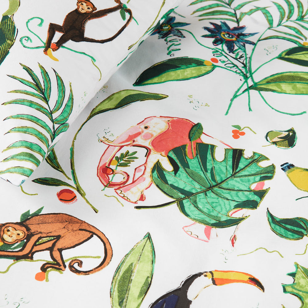 The Crazy Jungle Multi Cotton Quilt Cover Set by Bedding House is a cheerful and playful jungle duvet cover. On the cover tropical birds, monkeys, leopards and elephants are depicted between leaves and flowers printed in white, pink, red, brown, green, blue, teal, yellow, and orange colour tones. It is made from soft touch and quality 100% Cotton fabric.