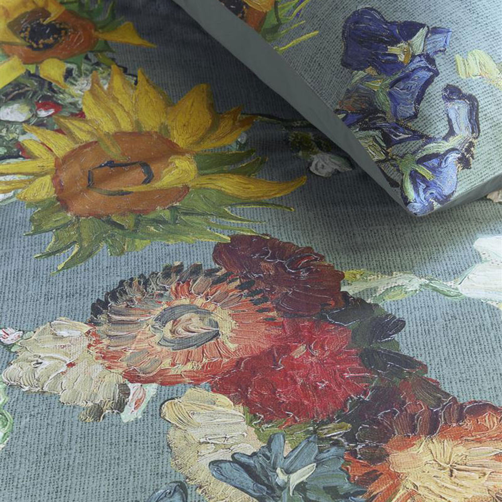 The design Van Gogh Partout des Fleurs Green Cotton Sateen Quilt Cover Set by Bedding House echoes the Bouquet d'Anniversaire. This bouquet is a treat from the Van Gogh Museum, and therefore from Vincent himself, in honour of the museum's 50th anniversary. This golden jubilee will be celebrated with a beautiful bouquet of cut flowers hailing from various flower paintings in the museum's own collection. For example, you can find flowers from the paintings: Irises, Small Bottle with Peonies and Blue Delphinium, Vase with Chinese Asters and Gladioli, Sunflowers and, of course, the classic Almond Blossoms printed in orange, yellow, white, green, red, brown, blue, purple, pink, and grey colour tones. These cut flowers are on a grey-green background, making this colourful all-over design a gorgeous, on-trend alternative to the same design on a golden background - and the flowers look beautiful! The underside of the quilt cover has a solid green colour. This is a unique design for a unique moment in the history of Van Gogh and the Van Gogh Museum.