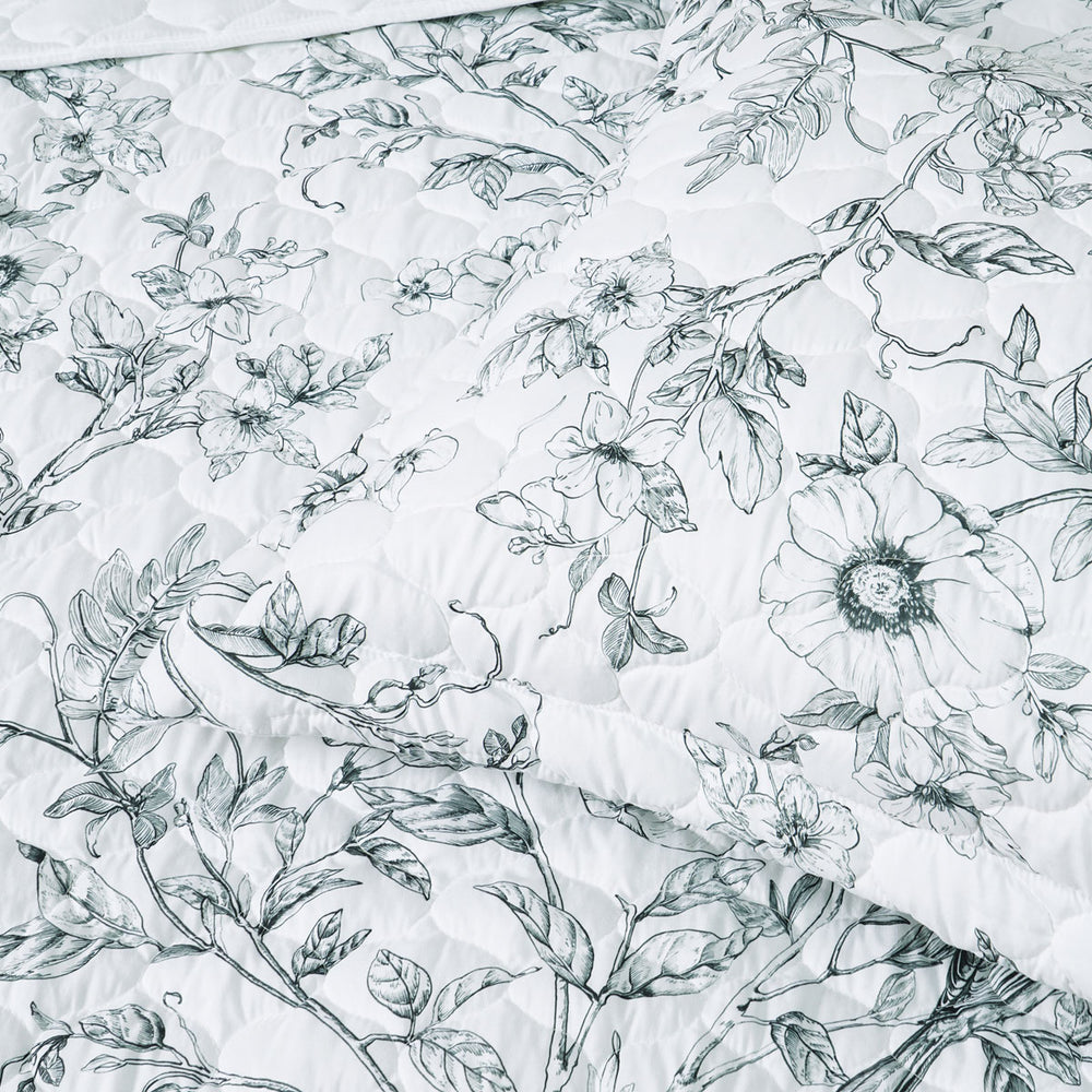 This delicate and timeless design transports you to the fresh countryside. Contrasted on a fresh white background, stunning floral outlines in black and grey cascades over the entire bed. Completed with a beautiful, sophisticated tailored edging, Gracie White Floral Printed Quilted Bedspread Set by Bianca is the perfect bedspread for your boudoir. Complete the look with matching accessories.