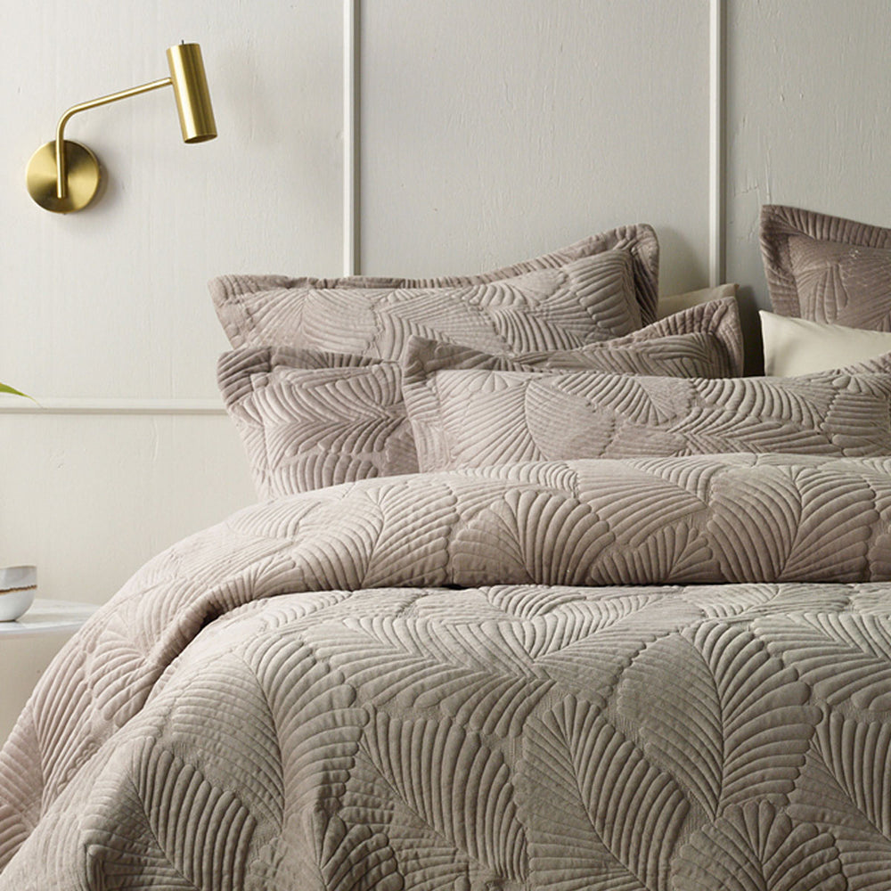 Made from super soft velvet fabric, Kairo Taupe Velvet Coverlet Set by Bianca features a quilted leaf design in stunning taupe. The neutral colour palette of this coverlet ensures that it will go in any bedroom within your home. The pillowcases and cushion feature an elegant tailored edge.