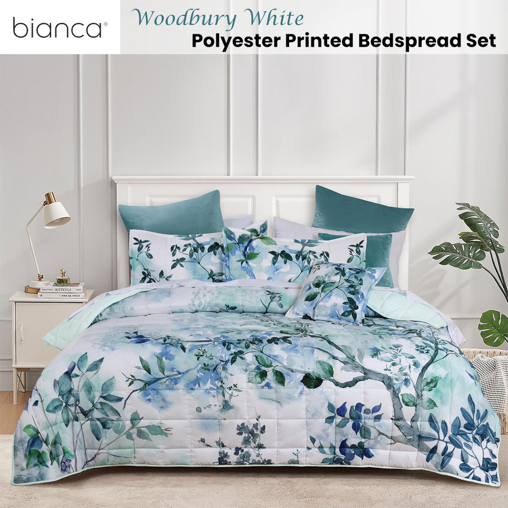 The Bianca Woodbury White Botanical Printed Bedspread Set blends soothing white, silver, green, blue, and teal in a graceful leafy botanical design, quilted in a refined square pattern. The tailored pillowcases and cushions elevate the look perfectly. Finished with Vivid Coordinates teal velvet European pillowcases and cushions for a touch of plush, contemporary elegance.