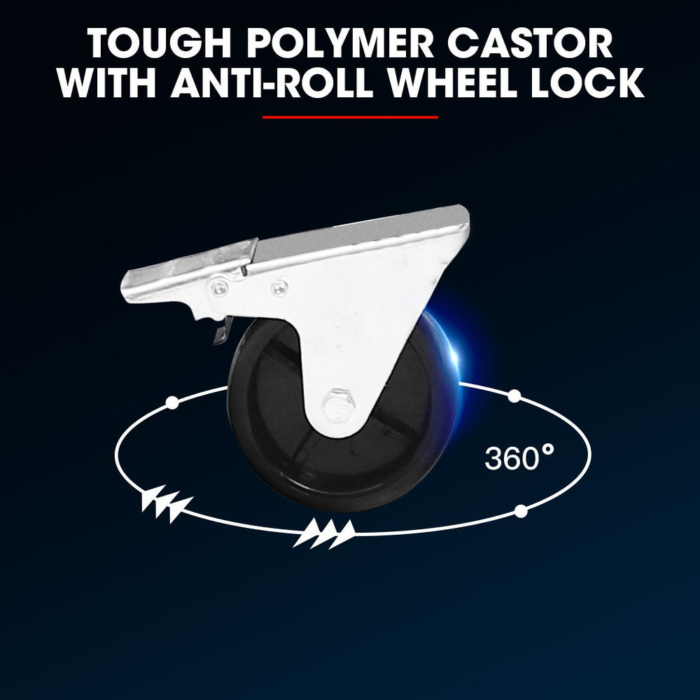 The Bullet 5 Drawer storage trolley comes with an upper chest where valuable or often “borrowed” items can be stored. The drawers have varying depths and sizes to accommodate all types of equipment and parts. The lower cabinet features a self-contained door that stays open and out of the way for easy access to its contents. This space is large enough to keep a range of bulkier items. The cabinet sits on top of four caster wheels with 2 x caster locks, so you have the option to secure it in one place or move it with you around a workspace. This compact double unit fits discreetly in even the smallest spaces or storage areas.