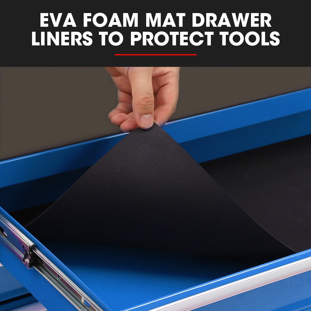 Both the cabinet and chest are built with high tensile powder coated steel enclosures. Equipped with an EVA mat, each drawer slides effortlessly in and out on smooth ball bearing rails, which makes finding and accessing each tool a cinch. The cabinet also comes with 3 pegs and the chest is easily transportable thanks to its side carry handles.