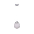 The Casablance Pendant Light offers a classic spherical design that scatters light via a dimpled diamond glass cover. The ceiling mount and main fixture feature a striking chrome finish from which the sphere hangs.