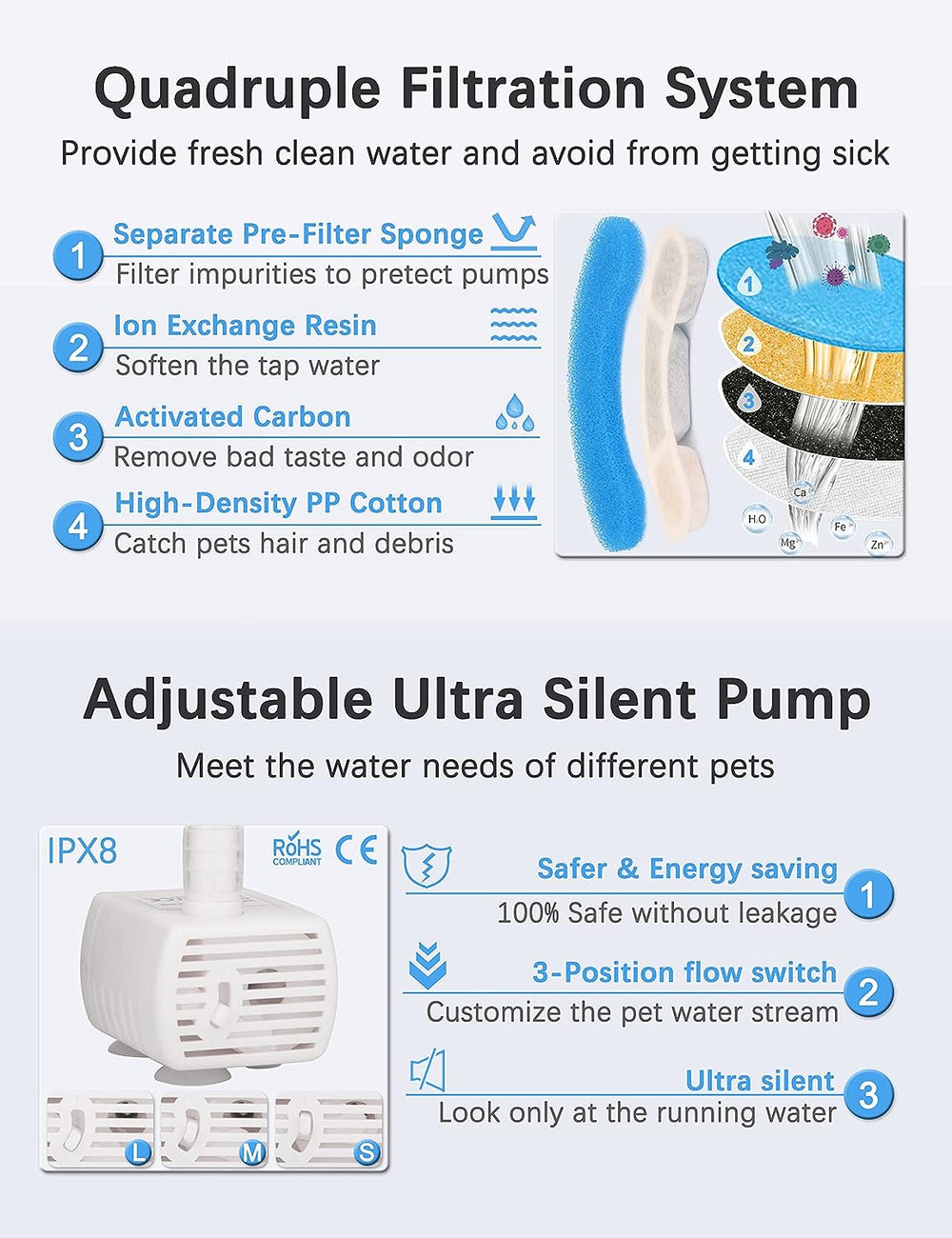 the cat water fountain storage bowl adopts a raised inclined slope and Low lying hollow design to form quadruple cycle system, which guide the coarser particle to the 3 layers filter to provide fresh clean water and avoid from getting sick. Sponge could catch cats hair and debris in the pet water dispenser, the ion exchange resin layer could soften the tap water, the third activated carbon layer could remove bad taste and odor.