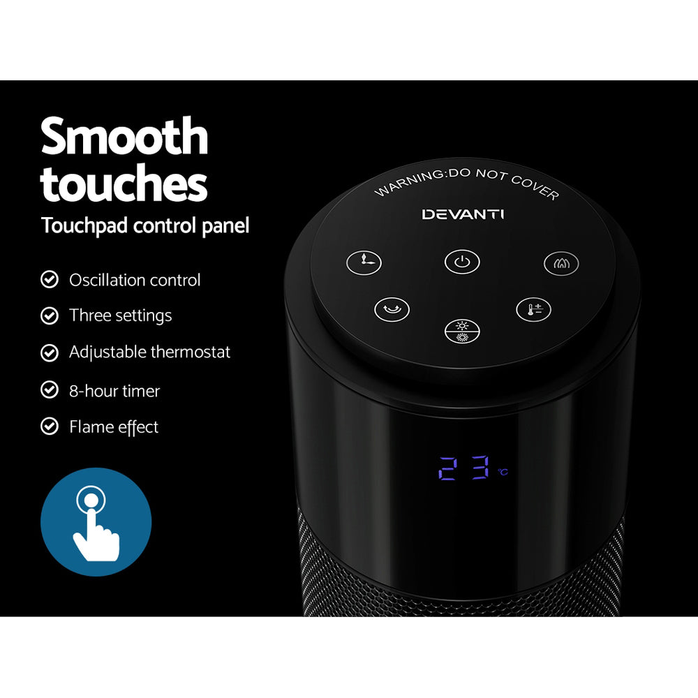 Need a little extra heating to get through winter? The Ceramic Tower Heater is here to solve your winter blues. With its high-quality rapid PTC heating system and fan system, the heater will have you warm in no time at all. It has three unique modes (fan, warm air and hot air) so you are always at the perfect temperature. It uses wide-angle oscillation to evenly heat your space and features an aesthetic 3D flame effect to mimic the ambience of a real fire without the risk. Easily control the heater with the top touch control panel: adjust the thermostat, oscillation and heating mode at any time. Use the eight-hour timer with auto shut-off to strategically heat your home and save energy. Best of all, the heater has built-in safety features such as an anti-scald protective mesh, a safety cut-off switch in case of tipping and overheating protection. For maximum comfort and warmth through the winter months, you cant go wrong with a Ceramic Tower Heater.
