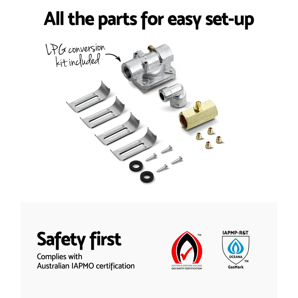 Use with natural gas (factory set) or universal LPG (with LPG kit installed)