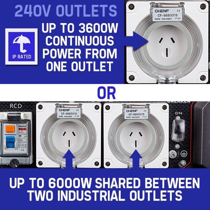 The GX12025i features Throttle and Digital Voltage Control employing GenPower's Patented AVR (Auto Voltage Regulator) ensuring stable voltage supply via two commercial-grade 240V IP rated protected outlets.