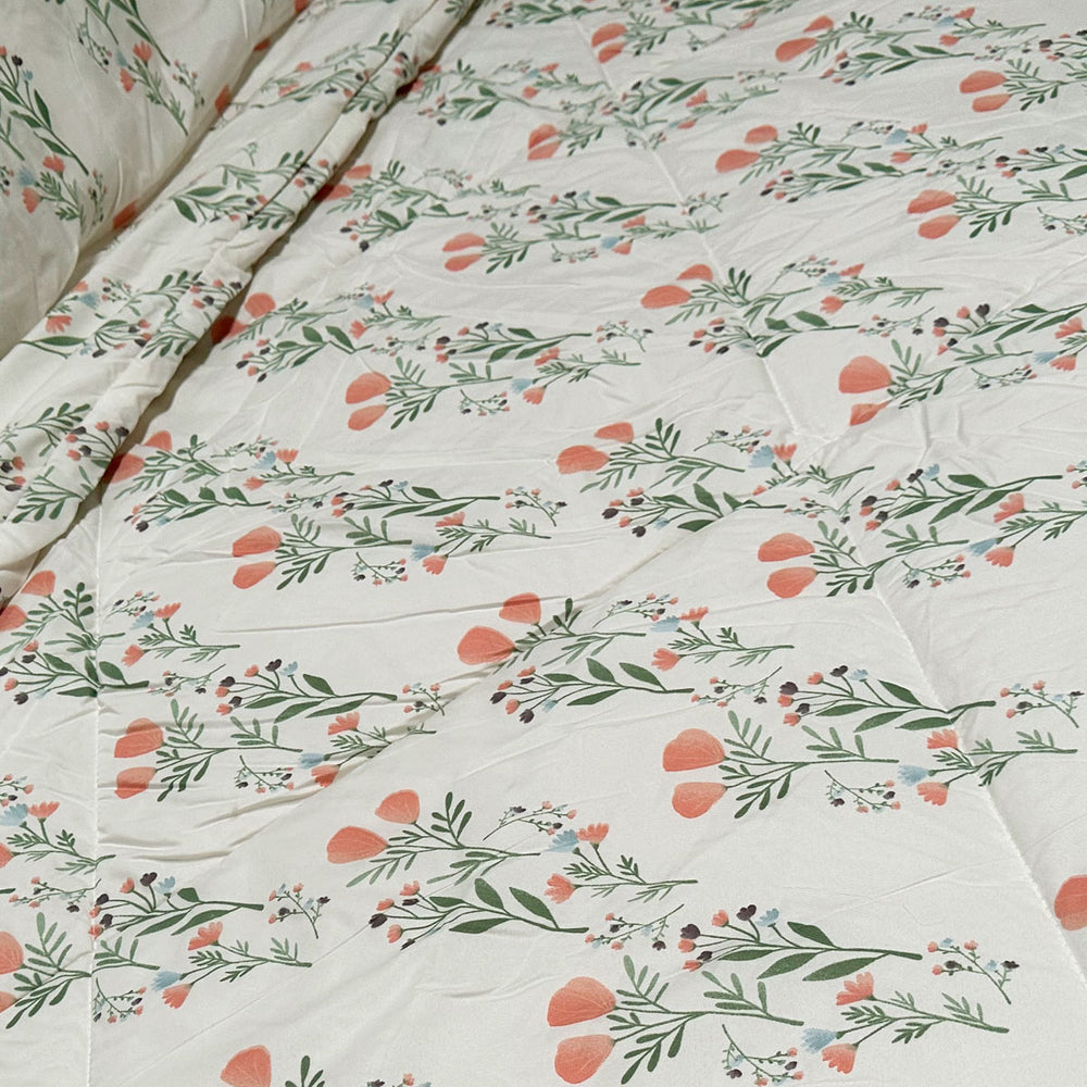 The 3 Pce Light Weight Microfiber Comforter Set Corbett Gardens Queen/King by Hotel Living is a bedding set that will brighten up your bedroom with its floral patterns. Light-weight. Microfiber face fabric with peach skin feel. Approx 200gsm -220 gsm polyester filling. The pillowcase patterns are randomly cut from the matching comforter face fabric. Comforters are quilted, Should there be any minor imperfect prints. An option flip it over as other side has the same prints, is fully reversible!