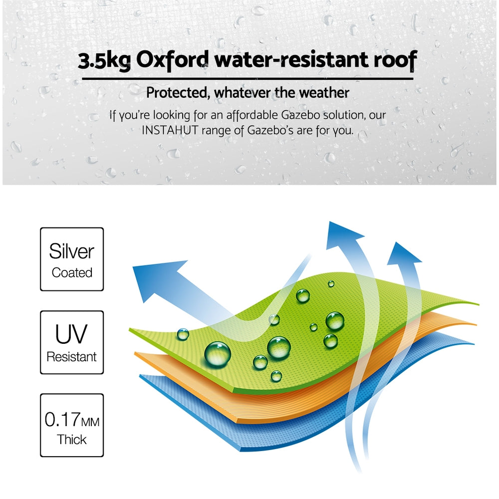 Featuring high density, long lasting PU coating oxford fabric with effective UV and water repellent treatments, this INSTAHUT 3X3 Pop Up Gazebo provides a lovely ground and canopy coverage of 300 x 300cm. It is perfect for all your upcoming outdoor activities, as a sunshade station as well as a shelter for unexpected rains.