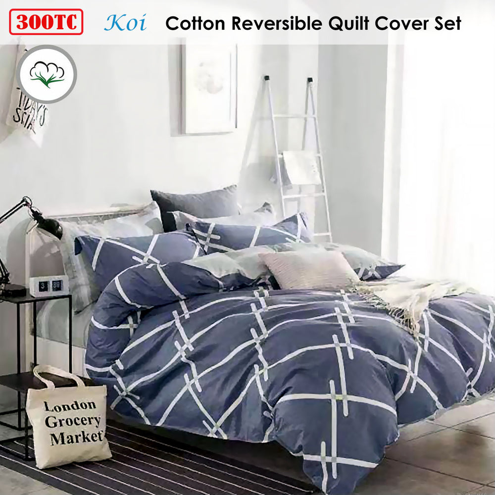 Add a modern and fun graphic into your boring bedroom with this 300TC Koi Reversible Cotton Quilt Cover Set. This quilt cover is perfect for all seasons. The design features a geometric pattern printed in light colour hues of white, silver, blue, and navy that will enhance the visual interest of your bedroom. It is made from soft and lightweight 100% Cotton fabric in 300 thread count with easy care properties and long lasting durability.