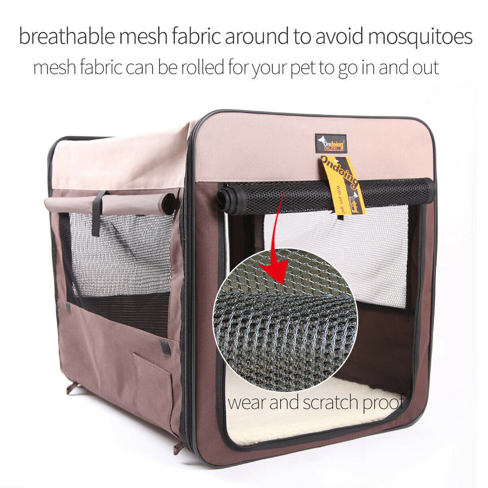 MULTI-USE :Soft pet indoor/outdoor crate, 2 mesh windows with curtain, large mesh opening. Suitable for car back seats and boot.