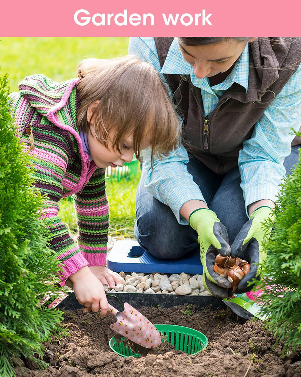 - Planting, weeding, and digging in the garden.